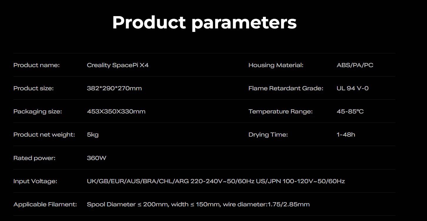 CREALITY 3D SPACE PI X4 FILAMENT DRYER, Capacitate: 4 role de filament, doua camere independente cu control temperatura independent, temperatura: pana la 85°C, dezumidifcare activa, Touchscreen 3.2″, Compatibil cu role de filament de 1kg, 2kg, diametru 1.75mm si 2.85mm.