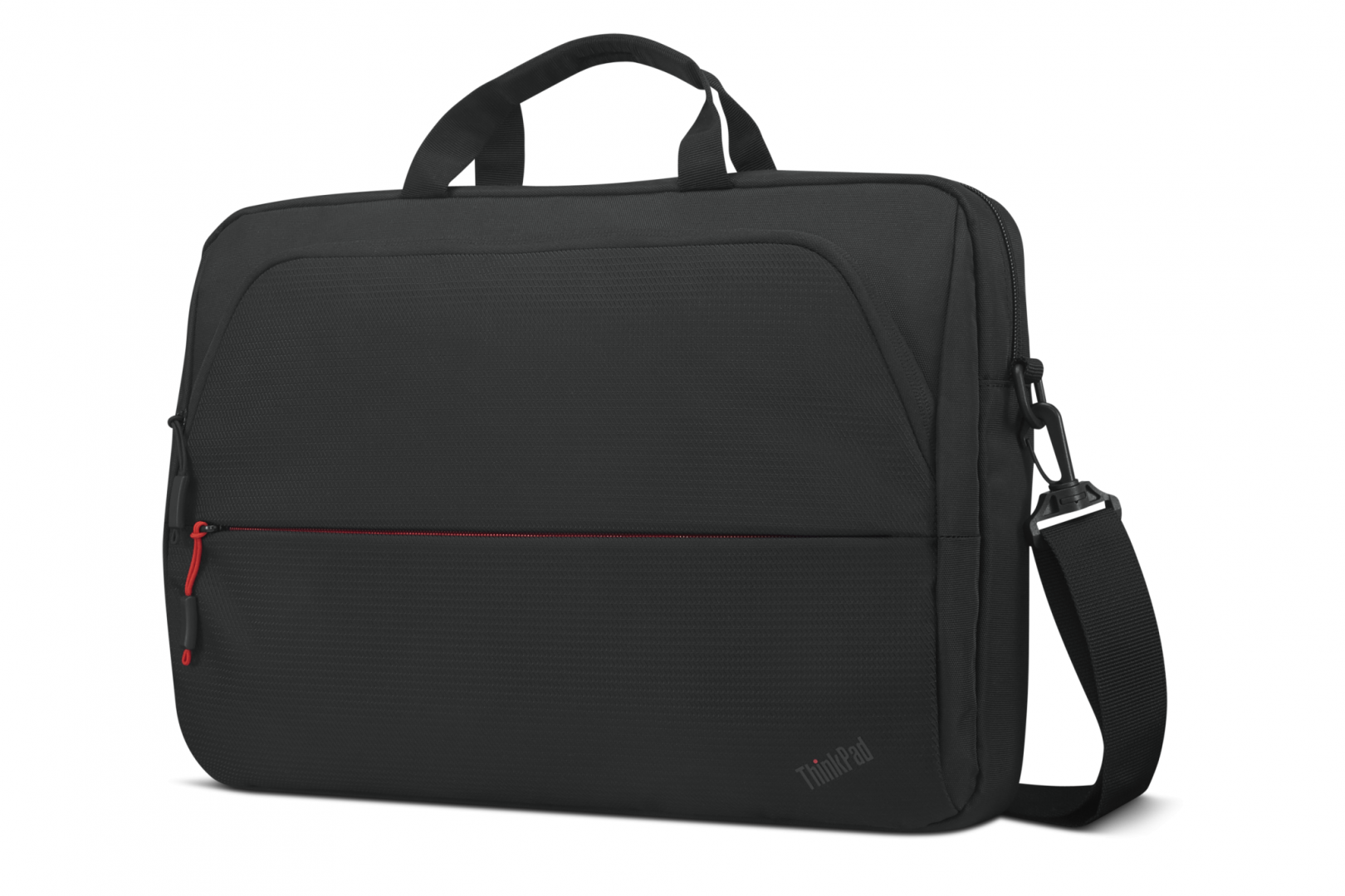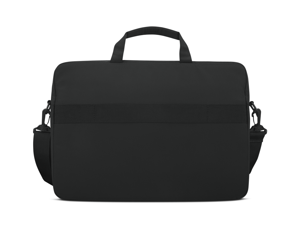 Lenovo ThinkPad Essential 16-inch Topload (Eco), Two main compartments, including a dedicated padded PC pocket, designed to fit Lenovo ThinkPad laptops up to 16″, Two additional front zip pockets for quick accessory access, Removable, adjustable shoulder strap for added comfort while carrying, Convenient luggage strap on back panel for travel and commuting, Easy-grip zippers for easy packing and unpacking, Classic black nylon exterior, grey interior lining, with splashes of classic red accents, Each bag contains the equivalent of at least two recycled plastic bottles, Polyester, RPET, PVC, Black