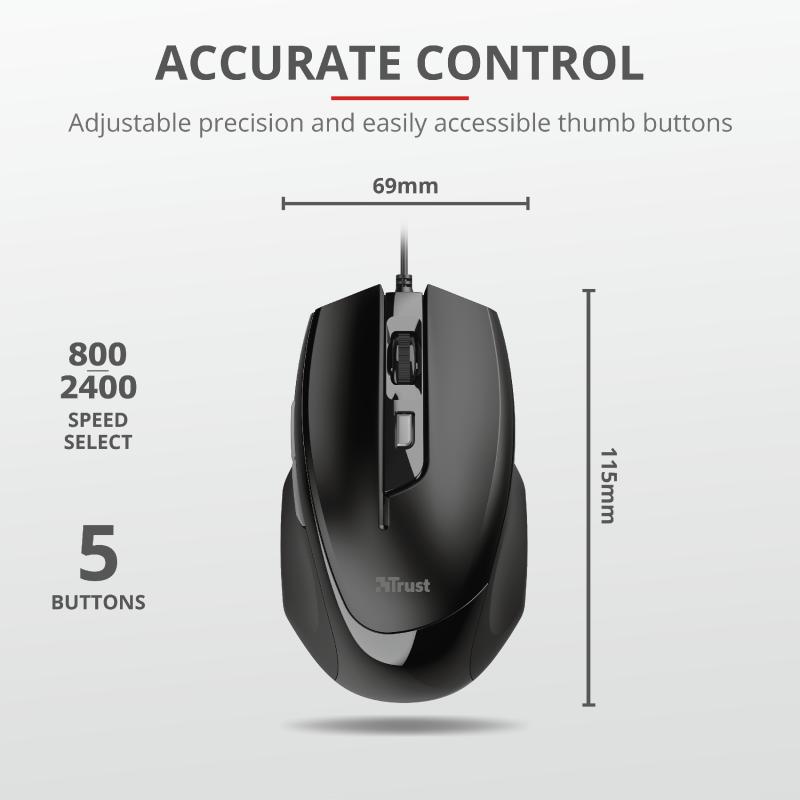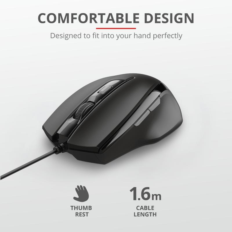Mouse cu fir Trust Voca Comfort Mouse Specifications General Height of main product (in mm) 115 mm Width of main product (in mm) 69 mm Depth of main product (in mm) 37 mm Total weight 100 g Weight of main unit 80 g Formfactor standard Ergonomic design no Connectivity Connection type wired Cable length main cable 160 cm Bluetooth no USB version 2.0 Connector type USB Features Silent click no Gliding pads teflon Software no DPI adjustable yes Gaming Designed for gaming no Lighting Lights no Input Power source USB Sensor DPI 800, 1200, 1600, 2400 DPI range 800 dpi – 2400 dpi Max. DPI 2400 dpi Sensor technology optical Compatibility Compatible Device Types laptop, pc Compatible Software Platforms Windows, Mac OS, Linux, Chrome OS Control Horizontal scrolling no Controls left, right, mid, forward, backward, dpi Number of buttons 6 DPI button yes Programmable buttons no Adjustable weight no Suitable surface non-reflective flat surface Left-right handed use right-handed Scroll wheel yes Trackball no trust.com/en/product/23650-voca-comfort-mouse